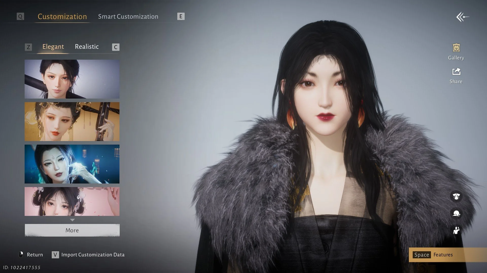 When you first enter the character creation screen, you’re presented with base models. Choose Model 1 (male) or Model 2 (female). You can choose a preset face: Elegant or Realistic. Click on More at the bottom of those presets to see more faces and some popular player uploads.