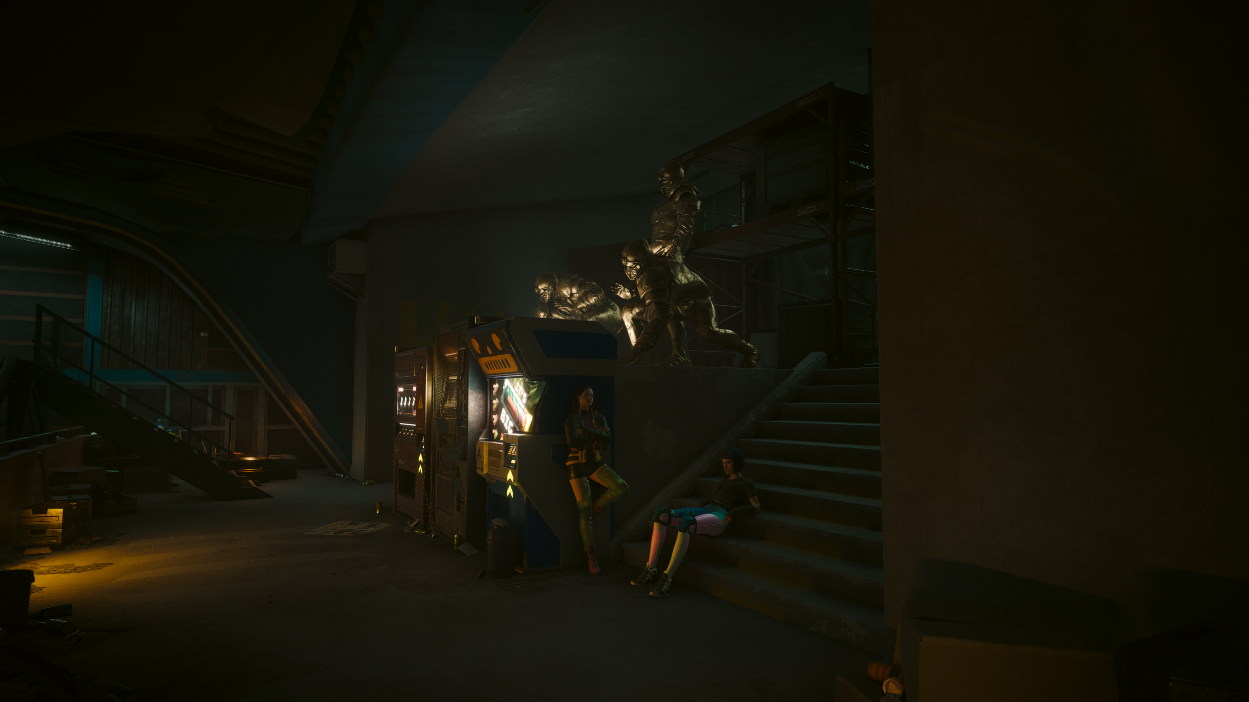 When Songbird leads you into Dogtown, the first place you enter is EBM Petrochem Stadium. In the Northwest of the stadium, you will see the car vendor. Head to the car vendor. Just beyond the car vendor is a stone staircase. Take the staircase. To the right, you will see another staircase and vending machines in front of a statue of three athletes. You will also hear the beeping of the Militech Relic Software. Follow the beep behind the statue, beyond some scaffolding (you’ll need to crouch). Jack in and download the software.